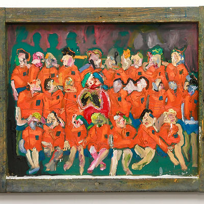 Koren's aspiration for collective class unity is evident in the expressive painting, the dense composition, and a spotted, rhythmic mass of color, which sometimes empties the individual student's identity into a sign. For example, his oil-on-canvas painting, the Class Photo, shows the typical group pose: the students face the camera in rows, with the teacher at the center.