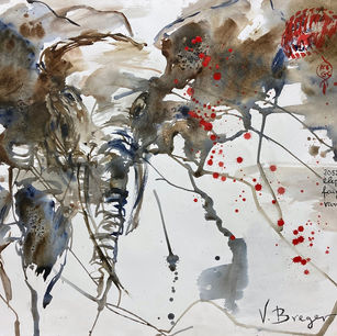 The objects in Breger's work are created from a chaos of blots: thin and spontaneous streams of color generated by shaking the paper, capturing a lion, a gazelle, and a nude headless woman's body. However, another look reveals barbed wire marks, either run over by a black tire or under the sole of a red shoe. The threat of COVID-19 brought her to preoccupation with the life cycle, and she expressed it in a technique of photo-painting. In recent years, Breger has created a symbol in her works that alludes to the double helix of DNA and its bases (A-T, G-C) which are shared by all life forms, and combined it with the peace sign.